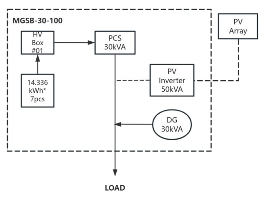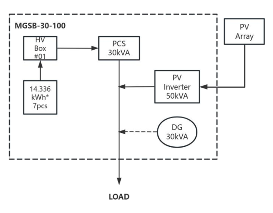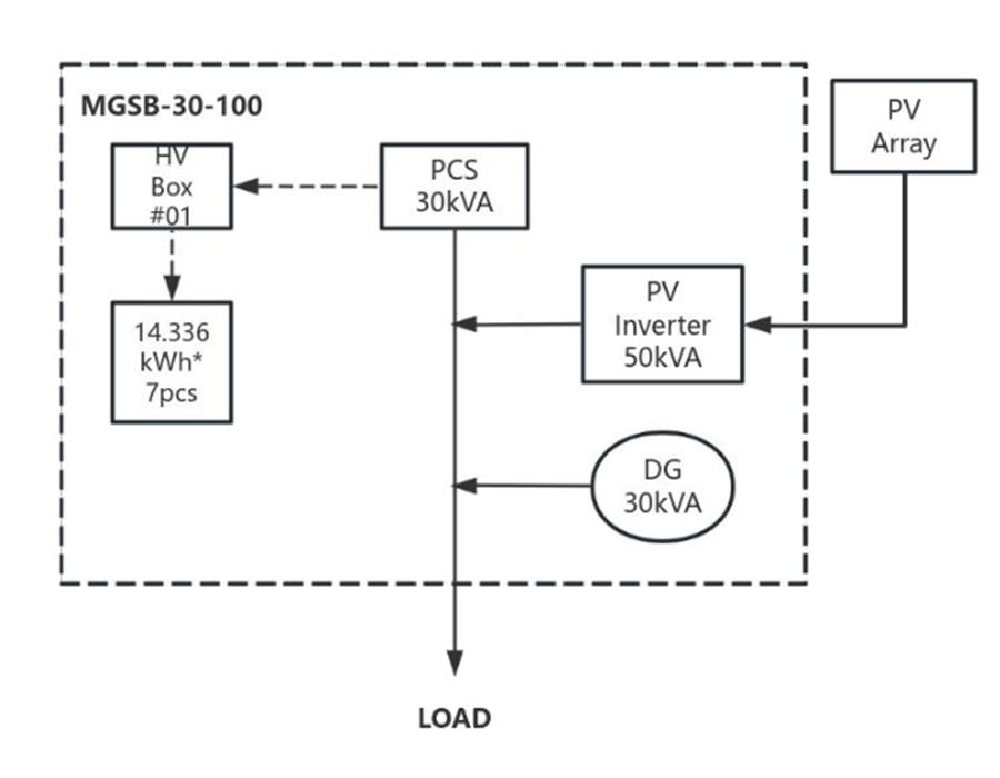 MGSB® est une nouvelle gamme de solution micro-réseau hybride intégrée sécurisée. Avec générateur diesel, stockage par batterie et onduleur solaire dans une seule unité sécurisée.